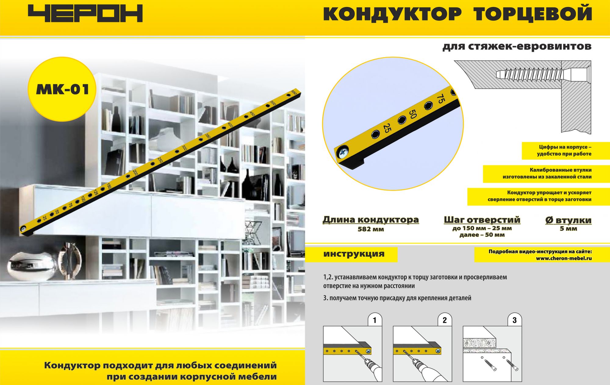 - Мебельный кондуктор кондуктор МК-01 предназначен для сверления отверстий 5 мм в торце плиты 16 мм с шагом отверстий 25/50 мм. (можно сверлить плиты и другой толщины с использованием переходников)