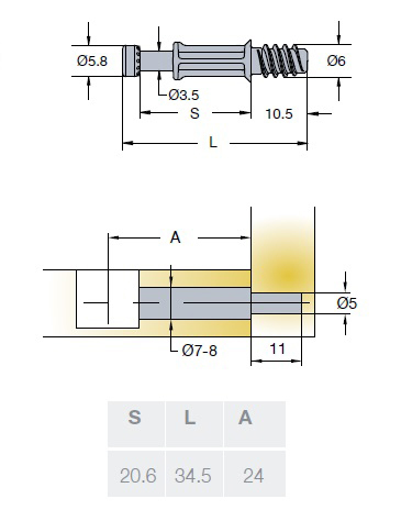 Дюбель из цинка и стали с большим сопротивлением кручению и вырыванию. Можно использовать со всеми эксцентриками Cam2000 и Cam3000 (Ø12мм и Ø15мм).