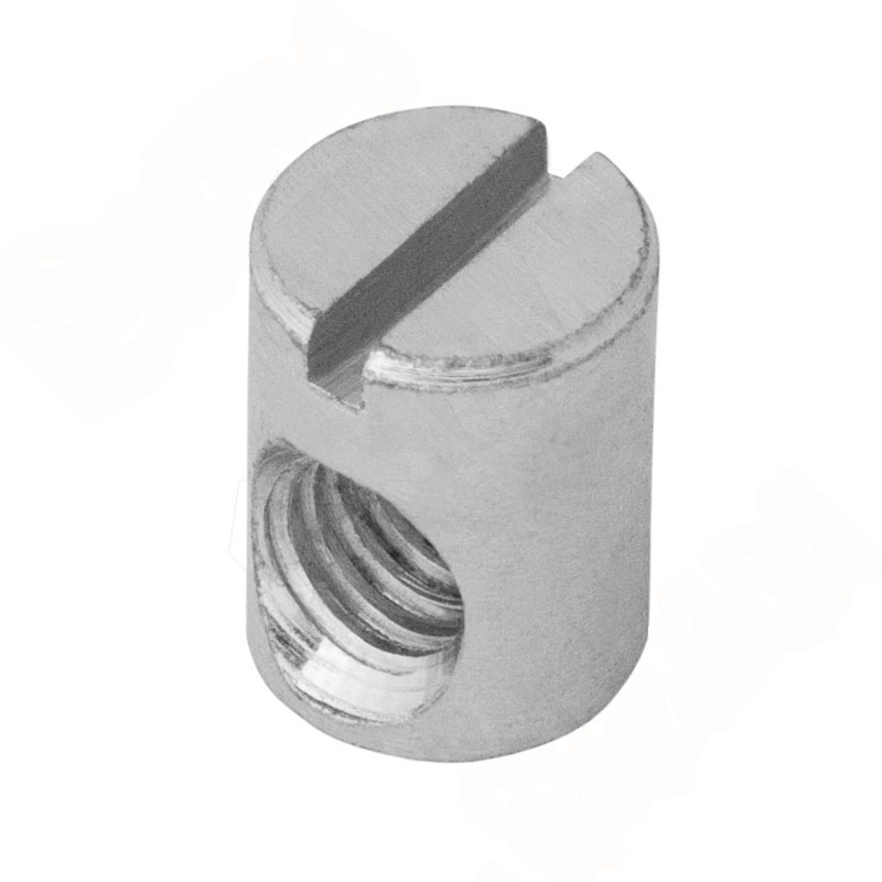 Стяжка-бочонок выглядит в форме цилиндра и за такую форму получила соответствующее название – «Бочонок». Имеет метрическую резьбу, проходящую сквозь тело гайки перпендикулярно. Для удобства монтажа с боковой стороны расположен прямой шлиц.