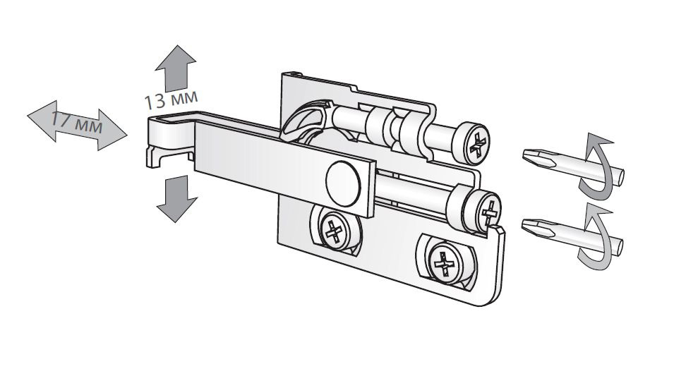 - Регулировка в трех направлениях - Scarpi-4 позволяет осуществлять независимую регулировку в вертикальном (до 13 мм), горизонтальном (до 8 мм) и фронтальном (до 17 мм) направлениях, что упрощает установку и настройку мебели;