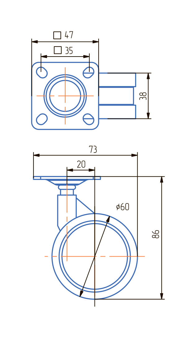 Опора колесная ОК60мм пластик с пятой м/х (ОКП60М.Х)