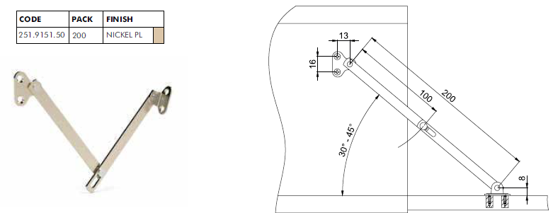 Кронштейн складной Metalimpex 200 мм угол открывания 30-45 градусов, никель. Арт: 251.9151.50