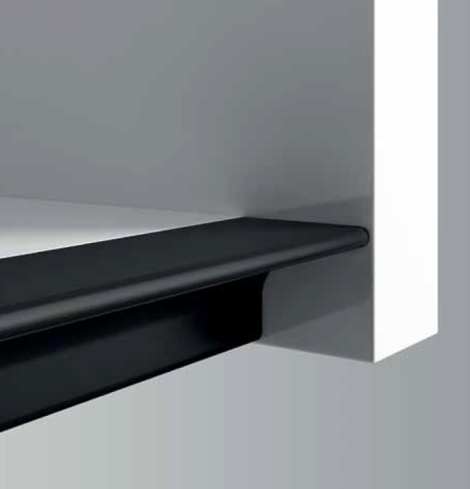 Скрытый профиль-ручка изготавливается из пластика ABS в шести стандартных цветах и предназначены для монтажа в днище навесного корпуса. Данное решение позволяет делать распашные и откидные фасады без ручек. Также профиль может монтироваться в боковину корпуса, например, в пенал со встроенным холодильником, что позволит сохранить единый дизайн всей кухни, отказавшись от ручек.