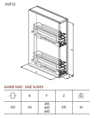 Корзина выдвижная, левосторонние направляющие полного выдвижения SIGE, доводчик, дно из меламина, корзина из круглой проволоки, разделители, глубина=500 мм, шкаф 150мм
