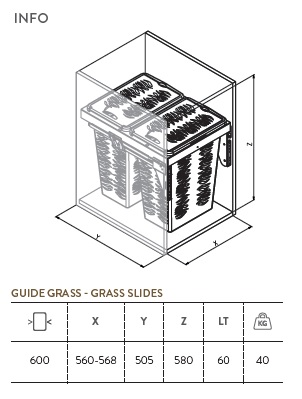 Корзина для белья, направляющие полного выдвижения Grass с доводчиком. Емкость 60 л. (2 х 30 л)