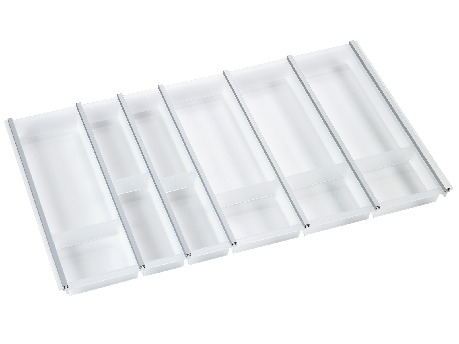 Элегантная и высококачественная система вставок для ящиков, выполненная из полупрозрачных пластиковых лотков и алюминиевых соединительных профилей. Благодаря сложному зажимному соединению они гибко приспосабливаются к разной ширине ящика. Каждый лоток может быть укомплектован регулируемыми перегородками.