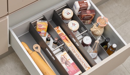 Система разделителей FlexBox упрощает хранение в ящиках. Контейнер организует предметы и предотвращает их падение. Благодаря оригинальной конструкции FlexBox можно легко вынуть из шкафа со всем его содержимым.