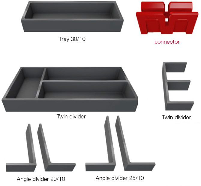 1 x Лоток 30/10, 1 x Угловой разделитель левый 25/10, 1 x Угловой разделитель правый 25/10