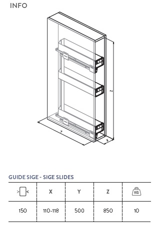 Колонна выдвижная, левосторонние направляющие полного выдвижения SIGE, доводчик, 3 корзины из листового металла, шкаф 150мм