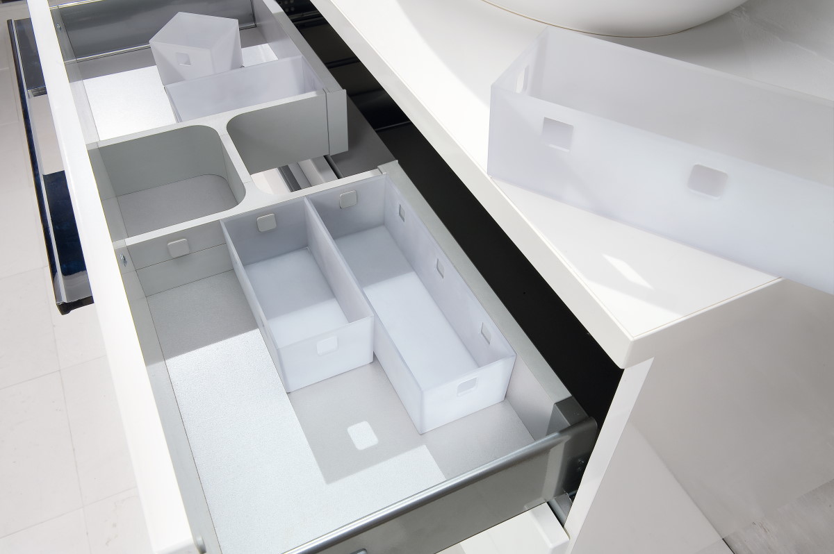 - Гибкое размещение маленьких, средних и больших вставок в ящике, в ящиках, в зеркальном шкафу, на полке или на стене.