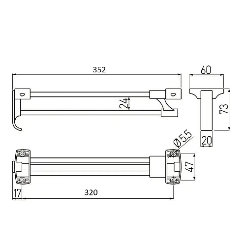 Обращаем внимание, что в наименовании товара указан габаритный размер штанги в задвинутом состоянии (L= 352 мм). Длина выдвижной части вешалки C = 320 мм.