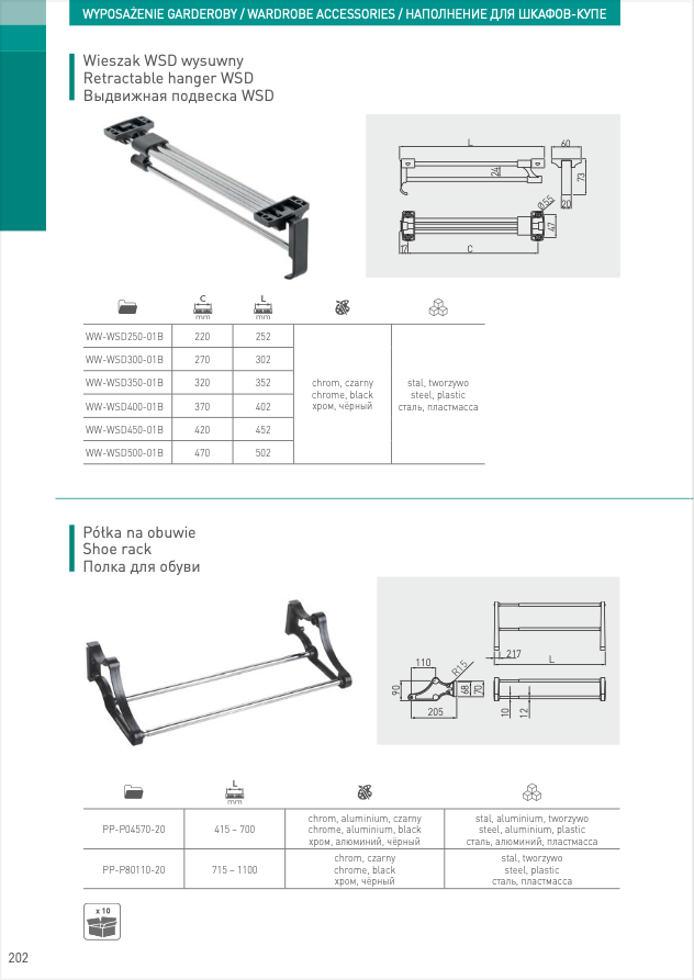 Штанга выдвижная PRESTIGE L-352 мм ЭКОНОМ - вешалка для одежды, устанавливаемая внутри гардеробной. В зависимости от размера шкафа подбирается штанга определенной длины.