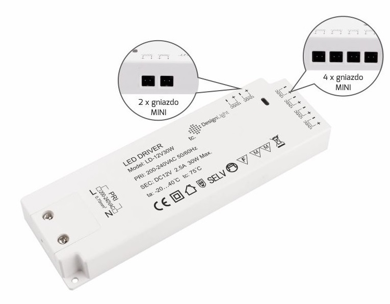 Блок питания LED model LD 30W 12VDC, без проводов, 6 мини-гнезд арт.TRA-LD-30W-T-01