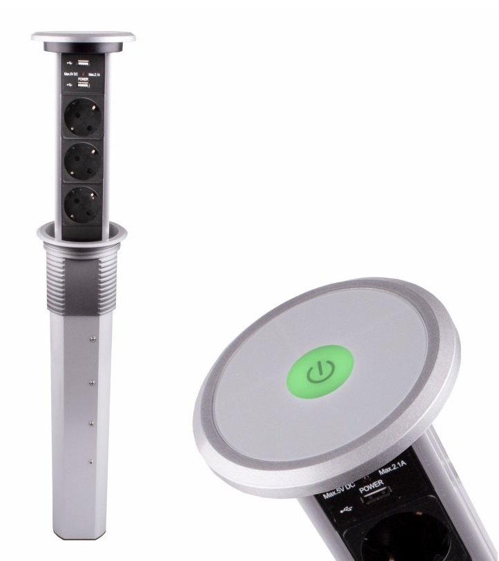 Удлинитель LIFT BOX автоматический 3xSchuco(розетка) 2xUSB, алюм, провод 2 м арт.LIFTBOX-A-ALU-3DE-U-01