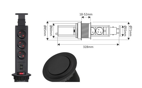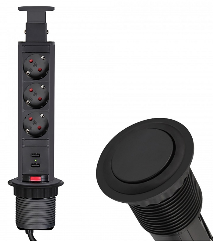 Удлинитель LIFT BOX 3xSchuco(розетка) 2xUSB, черный, провод 1,8 м арт.LIFTBOX-CZ-3DE-U-01