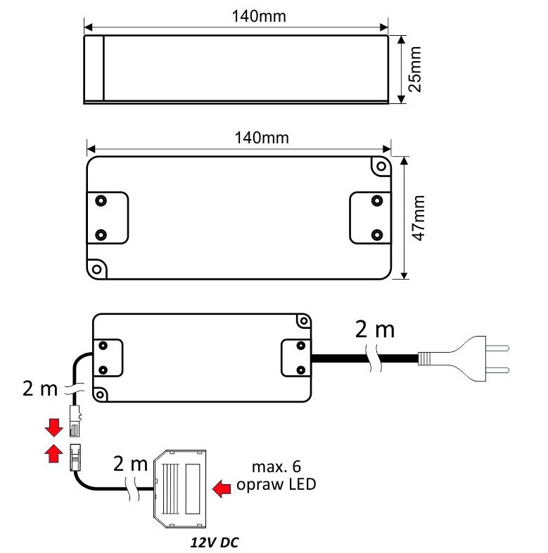 Блок питания LED STANDARD PLUS 33W 12VDC, белый провод 6 м, разветвитель 6 гнезд арт.U12-033-SP-2B0-4W6B