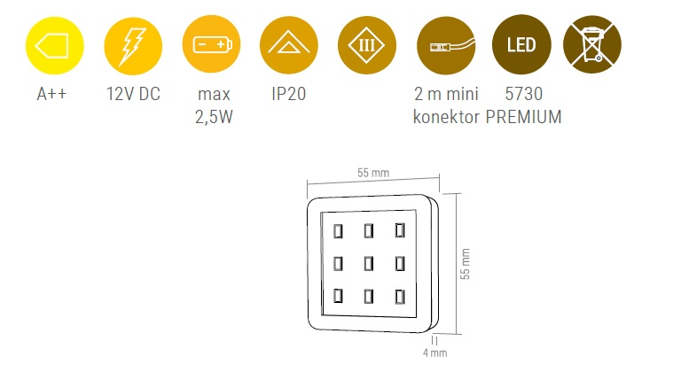 Светильник LED SQUARE 3, 2,5W 12VDC 9LED 4000К, провод 2 м, черный арт.SQUARE3-CZ-40K-01W