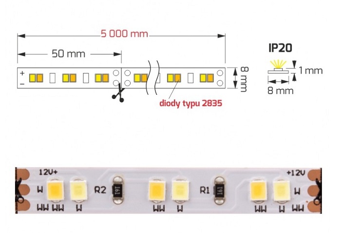 LED лента PREMIUM 600 LED 2835 IP20 8 мм 3000К/6000К 60W/5m арт.R-2835-600-20-BIK-02