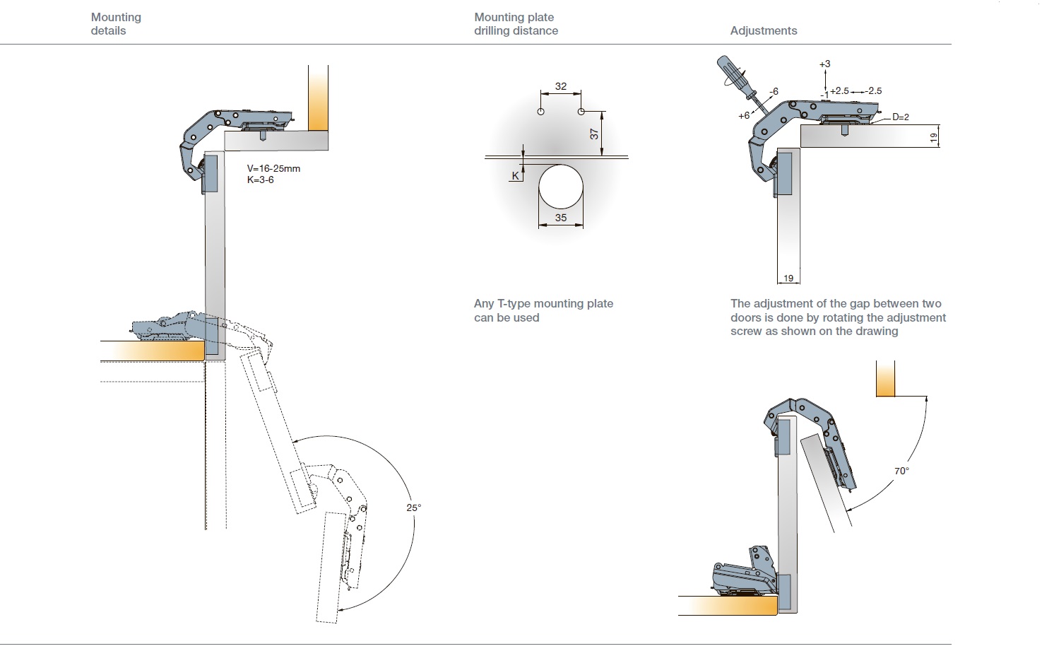 Петля T-type 70/48 мм, изготовленная из качественного металла с цинковым покрытием, применяется для складных деревянных фасадов корпусной мебели. Она может быть установлена как в детской комнате, так и в офисных или даже промышленных помещениях, госучреждениях и общепитах. Установка петли происходит на планку типа Slide-on, где чашка монтируется без использования винтов и саморезов.