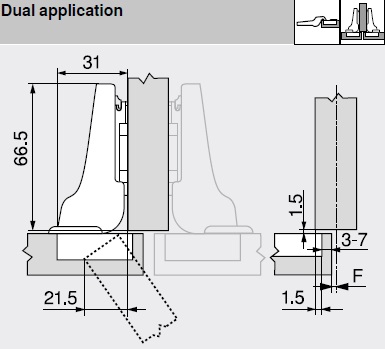 Петля 71B3650 от Blum подходит для деревянных фасадов и имеет полунакладной тип конструкции. Установку чашки петли выполняют без использования винтов или саморезов, что упрощает монтаж. Модель оснащена стандартной пружиной.