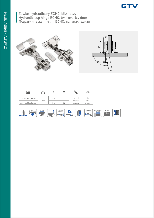 Петля полунакладная GTV PRESTIGE самозакрывающаяся без шурупа ZM-ECHC08-BEO