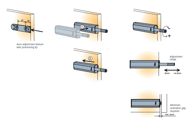 - регулировка устройства обеспечивает плотное закрывание и надежную работу дверок и ящиков даже в случае неточного монтажа