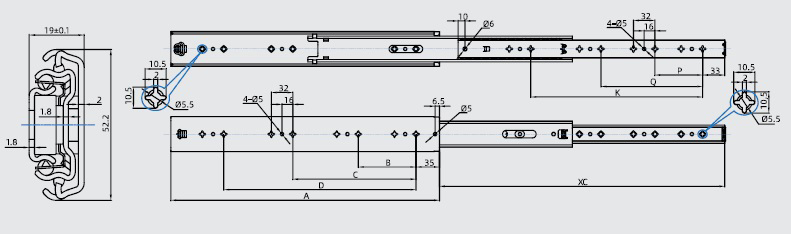Направляющие шариковые, полное выдвижение, толщина 1,8 мм, h=52мм, 100кг, L=450, цинк арт.620-5345-00